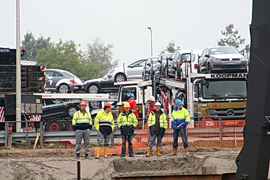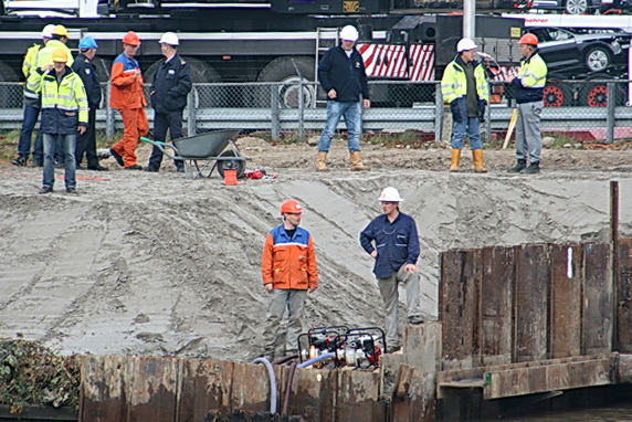 Het baggeren beleeft zijn laatste momenten, op de noordkant een rij voorlopig nog inactieve functionarissen…. Prachtige illustratie bij de uitdrukking: “De beste stuurlui staan wal…”