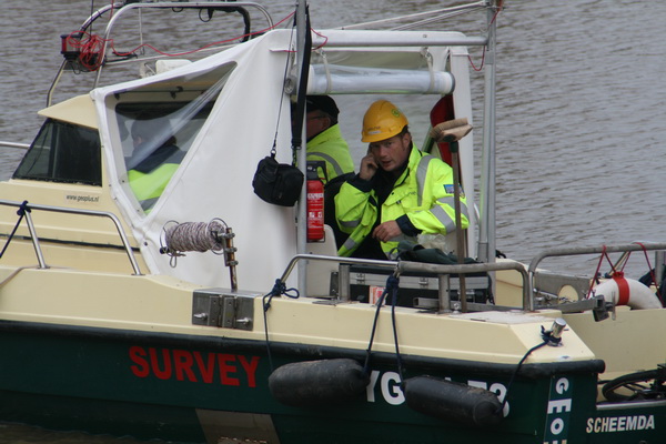 Een lid van het peilteam op de drijvende Geo Spider. Er is blijkbaar eindoverleg nodig met een buiten-beeld-instantie. Wie neemt de beslissing?