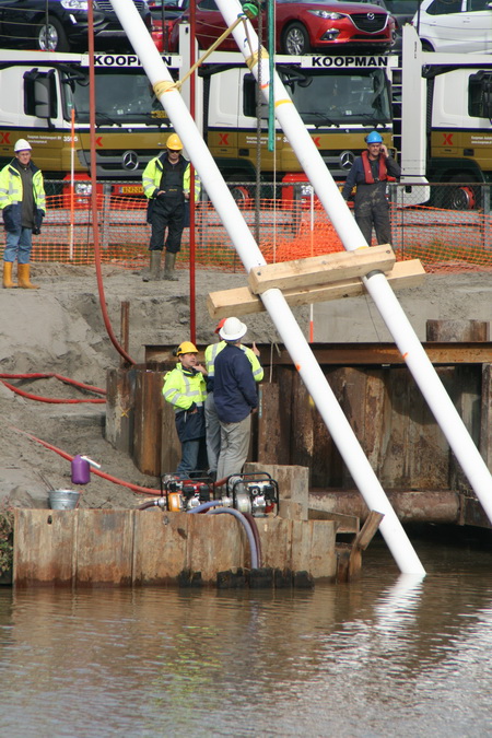 Het wordt nu drukker op de vlonder bij het water. Even een drukkertje proberen, wie weet… Nee, dat beetje menskracht is niet voldoende om de buizen in het gareel te krijgen….