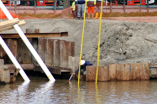 Eerst dacht ik dat de temperatuur van het water werd gemeten, blijkbaar ook van invloed. Toen bleek het zo’n roodwitte puntstok te zijn. Nee, er wordt niet tegen de buizen geduwd, hoogstens gemeten hoe diep het is…..