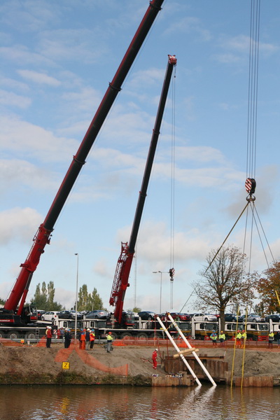 De man in rode overall en witte helm weet precies op welke punten hij de kettingen van de kraan dient te bevestigen om het gewenste resultaat te behalen. Hopen dat het hem lukt, misschien weet hij tactisch te duwen…..