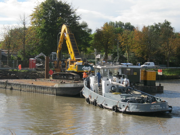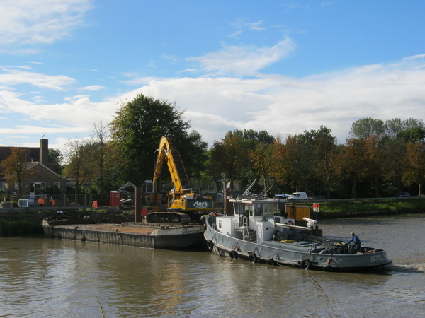 Afgelopen donderdag heb ik ‘toevallig’ nog wat foto’s gemaakt met de lutje Canon bij het kanaal en bij het tunnelterrein. Bij het kanaal is Sterk (“Sterk in heiwerk“) opnieuw bezig. Platen in de kanaalbodem, of eruit? Bovendien wordt de aansluiting van de verzonken buizen op de vaste-grond-leiding gefikst. Later bij het tunnelterrein een enkele foto van de bentonietmachine die diepe voren graaft en die volgiet met bentoniet. Het weer? Herfstiger, natter, wisselvalliger, hoort bij oktober….: