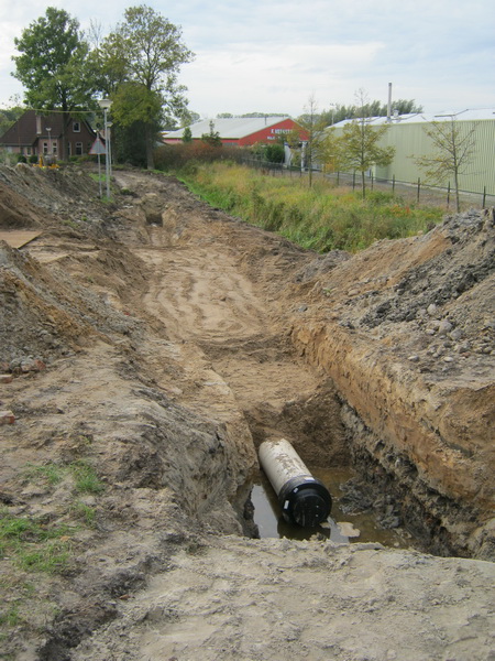 De kop van de Mokkenburgweg, bij de aansluiting op het fietspad langs de N355. De nieuwe waterleidingbuis ligt er, nu de aansluiting nog….