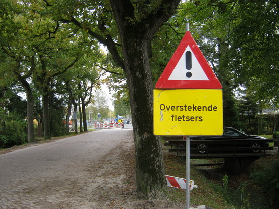 Volgend waarschuwingsbord, pas op! Overstekende fietsen! Bord bedoeld voor automobilisten, maar of die tijd hebben om de tekst te lezen en tot zich door te laten dringen?