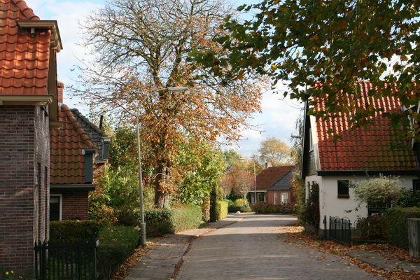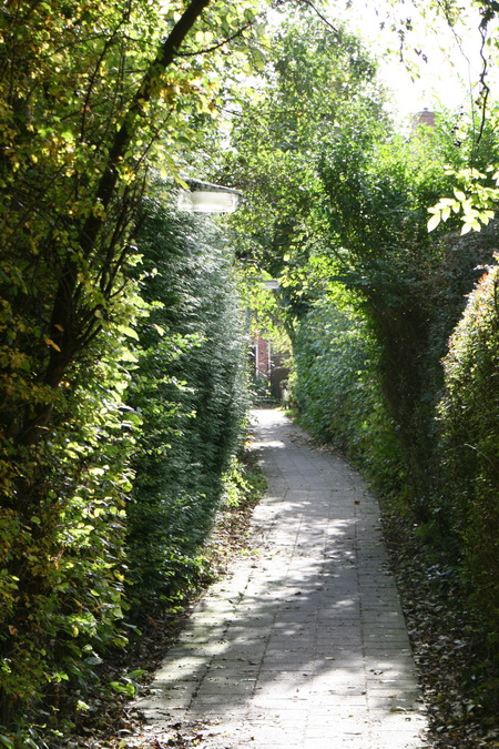 Het verbindingspad tussen Verlengde Oosterweg en Nieuwstraat, in herfstsfeer. Zo langzamerhand weer erg smal…