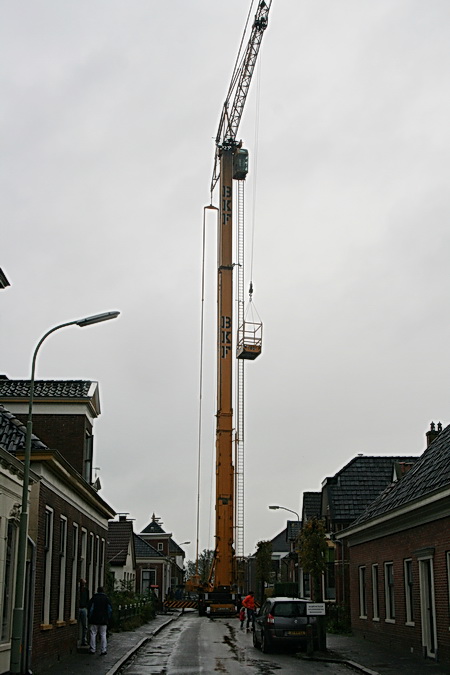 Getipt door Harm Eding van Openbare Werken (Gemeente Zuidhorn): “Vrijdagmorgen komt er een gigantische kraan in de Langestraat om noodreparaties aan de kerktoren mogelijk te maken!” De toren is maandag jongstleden beschadigd door de oktoberstorm, aan de noordwestkant. Stukken hout, lappen lood, lei….. Een gevaar voor de kerkgangers (de kerk wordt bereikt via de toren) en anderen die onder de toren of in de kerk moeten zijn. Urgent dus, deze noodreparatie. En spectaculair!