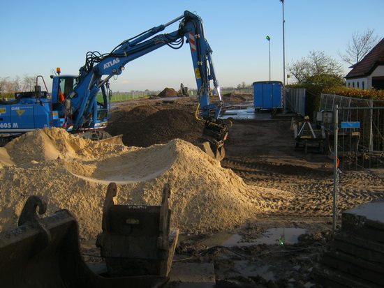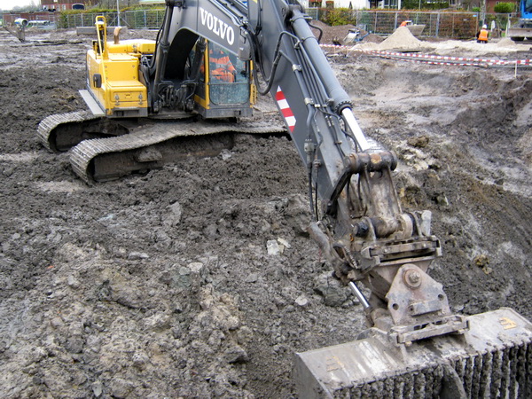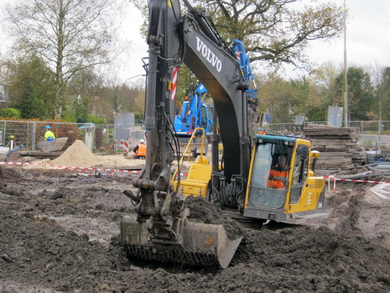 Dit is die plek aan de zuidkant van het tunnelterrein waar de bestrating is aangepakt. In beeld de blauwe GMB-grijper, manusje-van-alles onder de draglines…. Die man met zijn blauwe helm en dat geelgroene jack? Een GMB’er… Nee, geen demonstrant op het Tahrirplein of in de Chinese hoofdstad…..