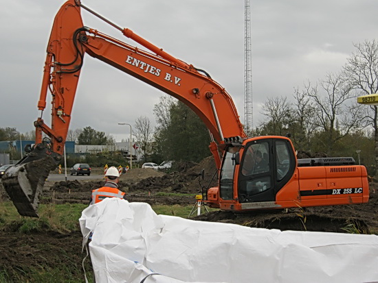 Aan de westkant van de N355 wordt gegraven onder toezicht van twee withelmen. Er wordt zo te zien een nieuw tracé uitgezet. Nieuwe omleiding? Of wordt dit de echte rotonde met de aftakking richting tunnel en een andere aftakking voor het lokale verkeer?