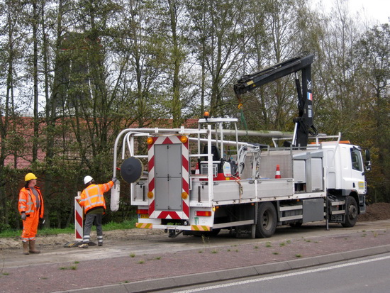 Je komt hier werkelijk ogen tekort! De lantarenpalenauto heeft de verwijderde paal geladen, kan nog wel weer worden hergebruikt, de paal bedoel ik…. En nu de volgende!