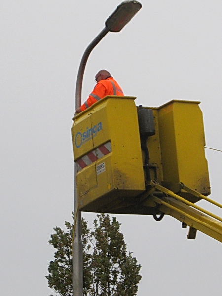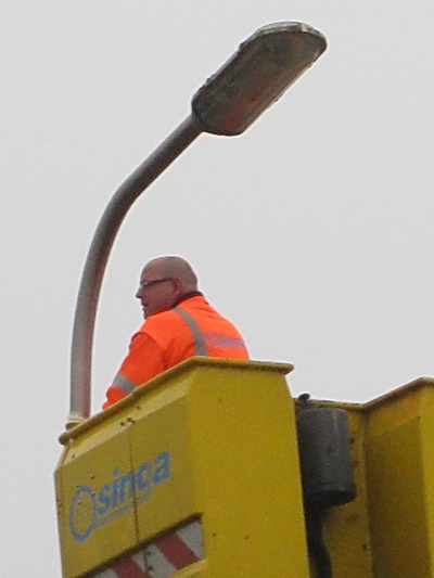 De lantarenpaalman in actie! Een kunststofkabel bevestigen aan het boveneinde van de paal vanuit het bakje van de hoogwerker. Het lijkt zijn dagelijkse werk….