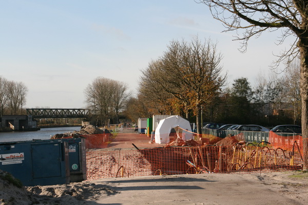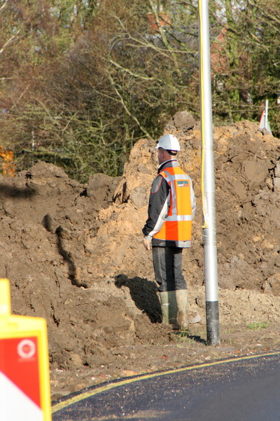 De toezichthouder met witte helm (wat betekenen die verschillende kleuren helm eigenlijk? GMB = blauw; HAK = groen, maar wit?) houdt de modderboel attent in het oog. Kijken of de kluit niet wordt belazerd… (En er zijn nogal wat kluiten!) Achter hem (directe bescherming!) de noodlantarenpaal, pal naast de noodomleidingsweg (die naar ik hoor niet echt bestand is tegen een strenge winter). Vandaar dat nu vaart wordt gezet achter de aanleg van de definitieve rotonde, kan die de taak van de noodomleidingsweg overnemen…