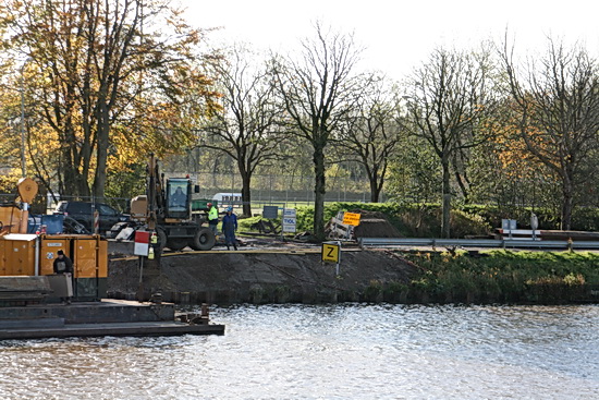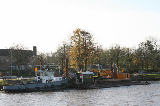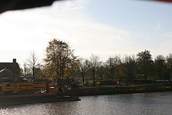 Bij het kanaal aangekomen via de Industrieweg moet ik even wennen aan de laag vallende zonnestralen (al ben ik bijzonder blij met deze herfstzon!) De Canon schudt zijn hoofd over mijn overmoed tegen de zon in te fotograferen. Ik hou mijn linkerhand beschermend boven aan de rand van de zonnekap. “Dat’s toch geen gezicht!” protesteert mijn camera.. Aan de overkant is STERK (in heiwerk) uit het Friese land weer aanwezig. Horizontaal weliswaar (= slaapstand), maar het geeft te denken. (En dat denken doen ze nu ook bij de Gasunie en Enexis vanwege ‘mogelijke beschadigingen’ aan de verzonken buizen! Aan de coating is te zien ‘dat er iets aan de hand is’ en die beschadigingen waren er niet toen de buizen werden verzonken en ook niet toen ze waren verzonken…. Ra ra hoe kan dat? Er worden allerlei berekeningen op los gelaten, bekeken wordt of er een duiker naar beneden moet… In ieder geval laat de definitieve aansluiting van de leidingen aan beide kanaaloevers nog even op zich wachten. Die volgt pas bij 100 % groen licht… En daarna worden de oude leidingen uit het kanaal verwijderd. “Als het meezit, kan het binnen drie weken gebeurd zijn…!” aldus een vriendelijke vragenbeantwoorder van de Gasunie.