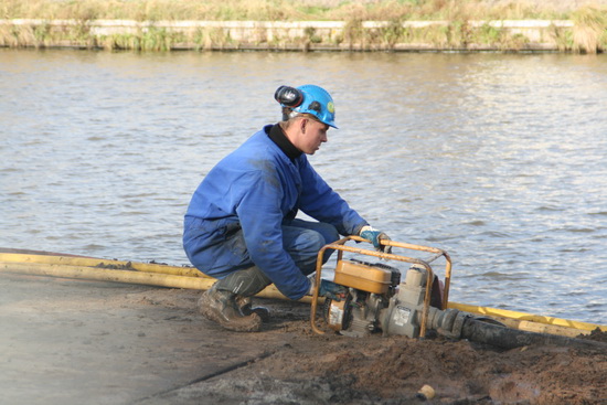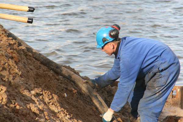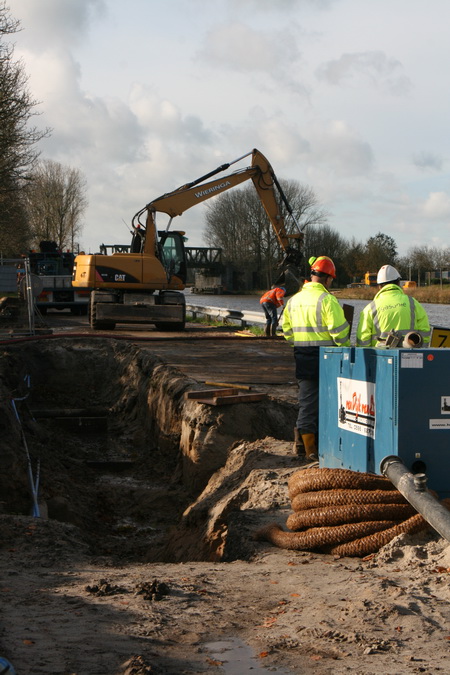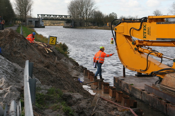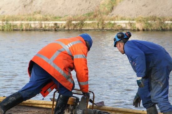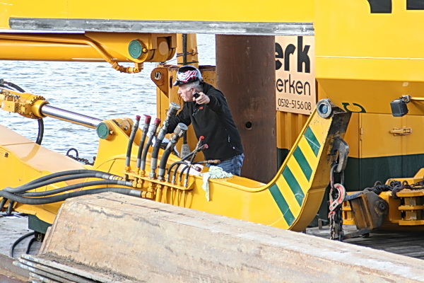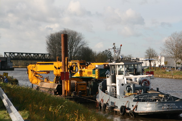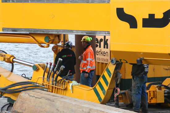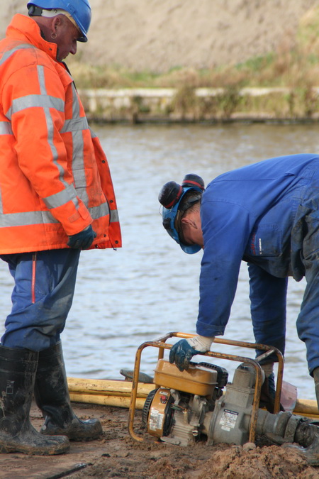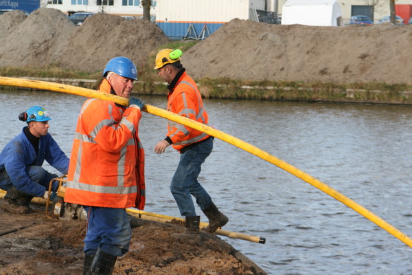 Wat ze hier nou weer doen? Voorlopig niet veel, ze zijn standby! Het kan zijn dat er alsnog een wandje de oevergrond in moet, vanwege troubles met de verzonken Gasunie- en Enexisbuizen!