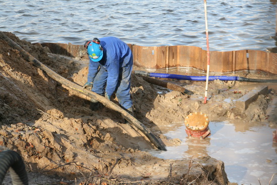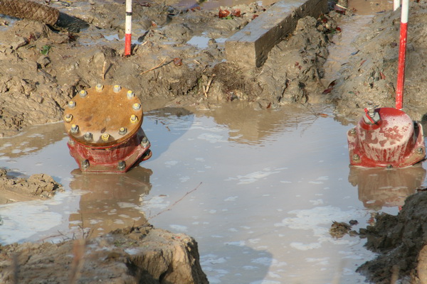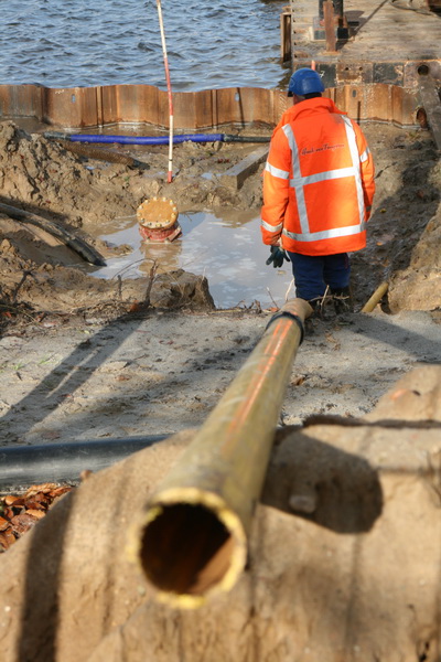 De aansluitingsplek zuid wat betreft de verzonken buizen van Gasunie en Enexis. Helaas verloopt de operatie niet geheel volgens plan, er zijn complicaties. Schade aan de coating van de buizen, wellicht lekkage. Er wordt gemeten, er wordt gerekend… Doeners en denkers bevolken deze werkplek!