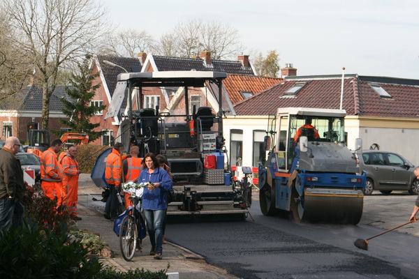 Een tweede wals beweegt zich langs de asfalteringsmachine die zijn taak heeft volbracht. De meeste KWS-werkers bekijken het resultaat, eentje hanteert de bezem. Postbesteller Heleen laveert er langs en tussendoor, Meulenbaargbewoner Steenbergen kijkt belangstellend toe!