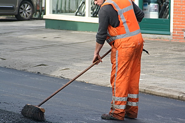 Hantering van de bezem voor het fijne werk, ter wille van de walsen. Komt er een mooi egale asfaltlaag!