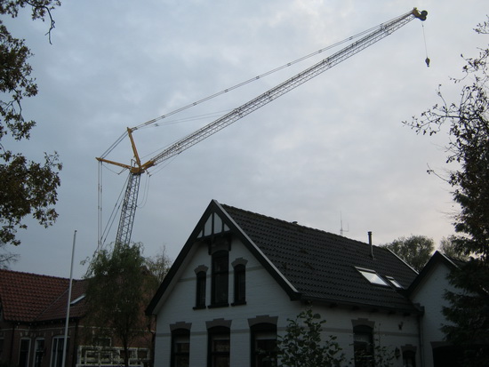 Dinsdag 12 november, kranendag! Zo stond er een enorme hijskraan met een bereik van heb ik jou daar, achter de huizen aan de Langestraat Zuid (westkant, Lammert Drijfhout e.a.) Aan de rand van het tunnelterrein noordwest. En zo was ie weer ingeklapt, tot nietigheid gedegradeerd… Keek je even niet, hé, daar is ie weer….. Hier lijkt het alsof de molen “Fortuna” fungeert als ‘kraanhouder’…..