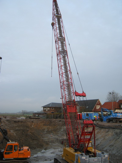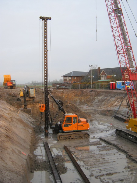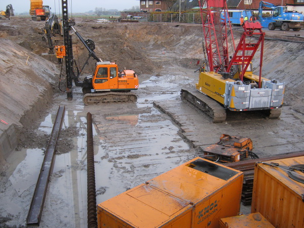 Even het totaalplaatje: De kraan rechts op de aangelegde vloer; de boormachine, nog nieuw zo te zien met op de voorgrond een boor en een balk; op de achtergrond de Volvo-graver, op de helling, en verderop een rupswagen voor de afvoer van de grond. Rechts op de achtergrond het onderkomen van de Kok-familie (van wie de pater familias vooral bekendheid geniet als ex-voetbaltalent en als stripboekenverzamelaar… Hij heeft, bijna, de hele vroegere Chr. MAVO tot zijn beschikking om de strips te exposeren!