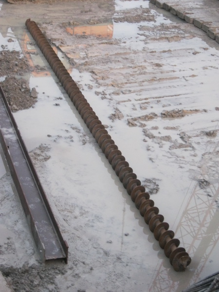 Kijk, dat is nou zo’n boor! (Toch iets anders dan een kurkentrekker!) Links een ijzeren balk die ook de grond in moet om de wanden steun te geven. En Moeder Aarde maar zuchten over zoveel pijniging….