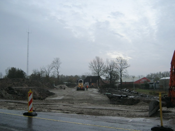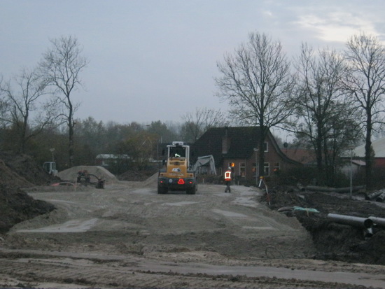 Je ziet de vorderingen bij de rotonde-aanleg, de familie Hekkema zit wat dat betreft op de eerste rij! Het tracé is uitgegraven en intussen met vrachtwagens vol zand ‘bestreken’… Daarop komt nog ‘gemalen steen’ als ondergrond en dan gaat de asfaltering plaatsvinden in het weekeinde van 29/11 – 1/12!! (Dan ligt dus de N355 tussen Grijpskerk en Zuidhorn eruit!!)
