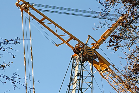 Tussen het lover van de eiken aan de Langestraat Zuid is de superkraan zichtbaar, althans de intrigerende kop van wat bijna een kermisspul lijkt…. En deze kraan is weer onttakeld en gaat naar de oostkant van de tunnelgraverij, maandagavond 18 november a.s.
