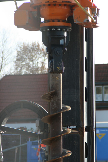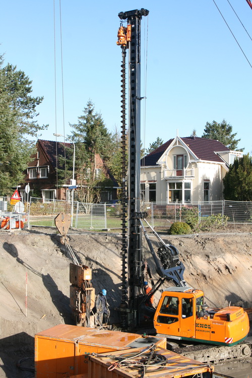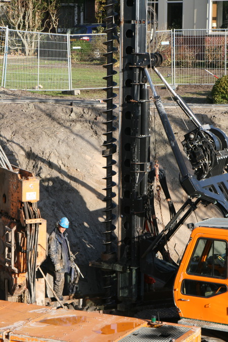Zo te zien is dit vrij nieuw materieel, of ze zijn geweldig intensief aan het poetsen geweest! Gaten boren, daar komen balken in, of buizen? En dan? Het traditionele heien kan hier niet, dan dreig je meteen een deel van de directe omgeving te slopen…