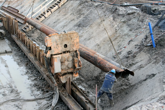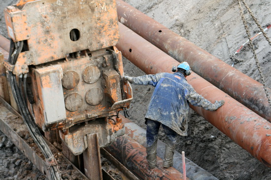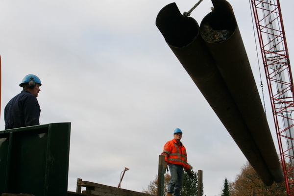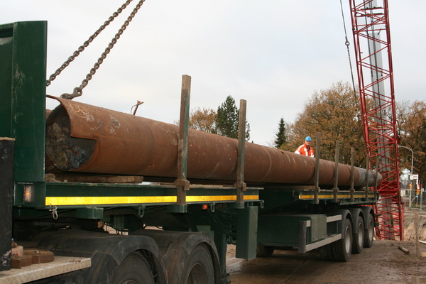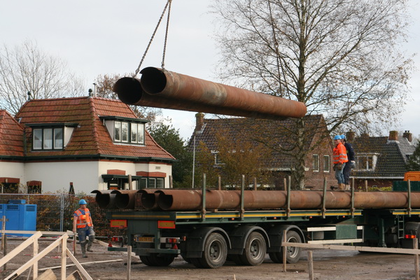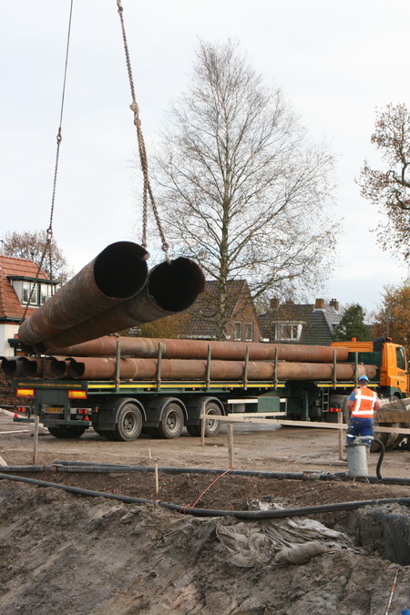 En weer bestaat het ontvangstcomité uit slechts één persoon, de ‘grondman’. Ook deze buizen komen onbeschadigd op hun (voorlopige) plek!