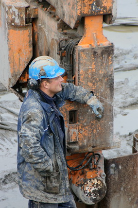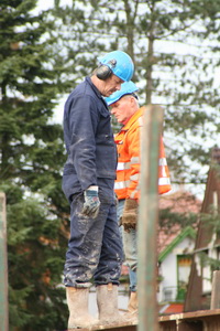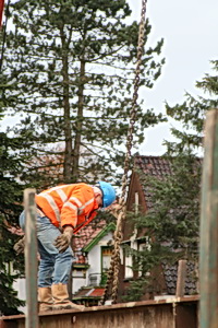 Beneden ontfermt de ‘grondman’ zich over de neergelaten buizen, zodat ze keurig op hun plaats belanden! Achter de steunwand aan de zuidkant!