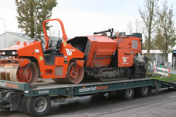 Aan de Industrieweg ‘gespot’: Een aanhanger van Oosterhof Holman met twee boeiende machines! Links een kleine wals. En rechts? Rupsbanden in ieder geval… Een kleine asfalteringsmachine??!