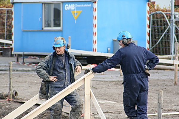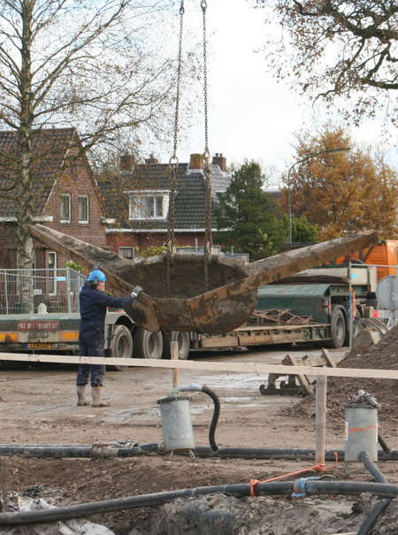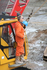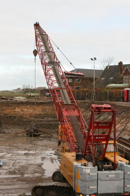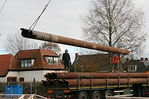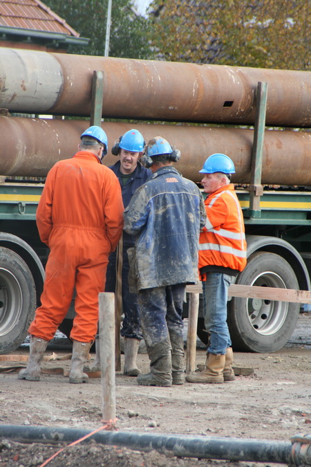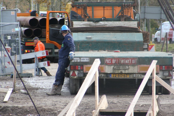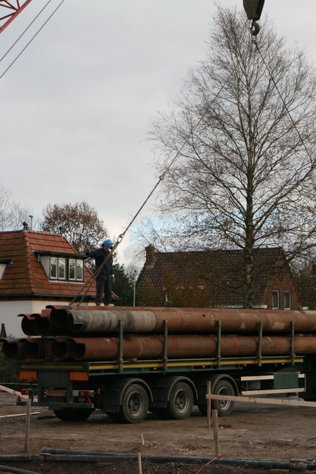 Zie je, nu worden de grote buizen (die met de lippen…) gelost. De buizen die tussen de steunwanden komen om de boel solide te stutten….. En dan maar weer dieper graven….