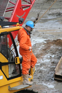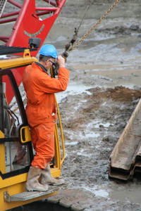 Ja, zo’n helm… Of ie nou blauw, of wit, of groen is… Het knelt! En dan is het af en toe prettig om even “die potdeksel” af te zetten! Zoals deze wachtende kraanmachinist doet…