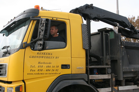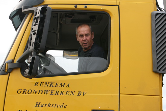 Intussen blijft een chauffeur van Renkema Grondwerken even staan op de afslag van het dorp naar de N355. (Zo’n auto heeft natuurlijk wel iets te zeggen…) De chauffeur kijkt geïnteresseerd naar het grote tunnelgat en heeft duidelijk behoefte aan een praatje. Weer een gaatje gevuld!