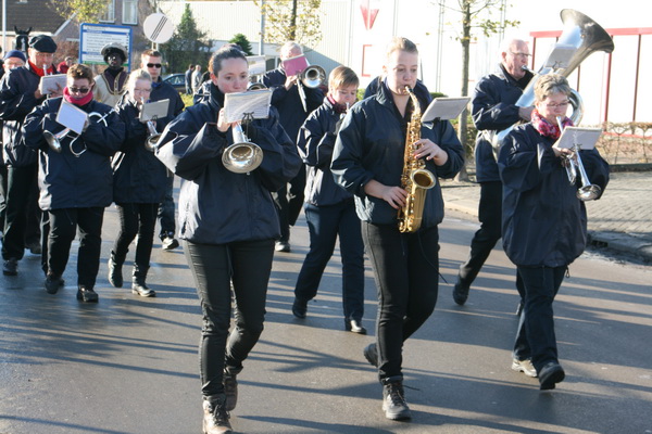Voorop het muziekkorps van “Ons Ideaal” uit Grijpskerk, sinds jaar en dag het huisorkest van de Sintintocht in Noordhorn!