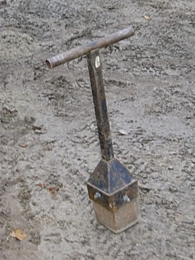 “Dit is een handstamper, deze wordt gebruikt om de kantsteen aan te stampen of om het putkopzand aan te stampen. Ook wel om trottoirbanden aan te tikken, als deze zijn ‘ondergevuld’ met zand, om ze weer op de goede hoogte te krijgen.”