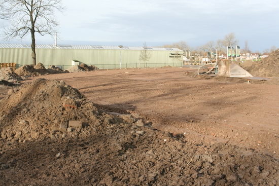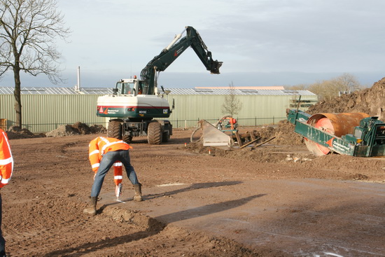 Een kiepwagen van Meindersma brengt nog wat meer gemalen steen…. De shovel van de Gebr.Kok staat al te popelen om de bult met de grond gelijk te maken….