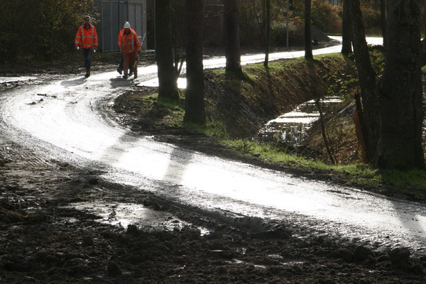 De slinger van de Mokkenburgweg in tegenlicht! Er naderen drie rotonde-medewerkers, ongehelmd zo te zien, ook wel eens prettig…