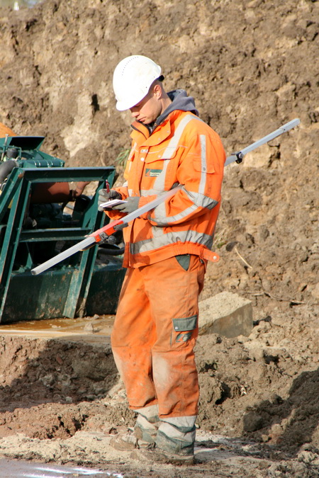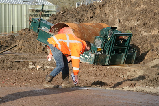 De oranje werkers zijn weer aan de slag gegaan, “de lange” is actief met een spuitbus. Nee, geen graffitti… “Waarvoor is dit?” “Voor de frees….!”