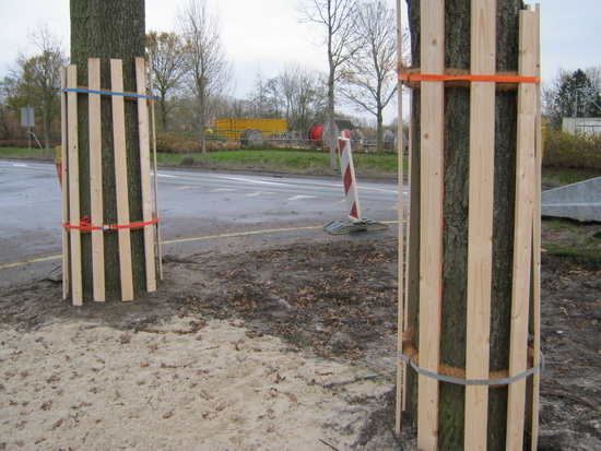 Na het huidige weekeinde wordt er beton gestort in de tunnelkuipen. Dat betekent dat betonauto’s af en aan rijden en dan wil de ruimte wel eens beperkt zijn. Voor alle zekerheid zijn de beide bomen bij de tijdelijke inrit met latwerk beschermd. Sympathieke maatregel!