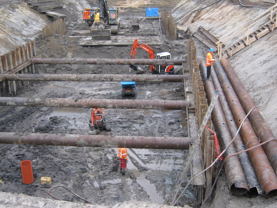 De tunnelbouw vordert spectaculair. Aan de noordwestkant valt de zandbaan op, waarop vloeibare beton is gespoten. Na het weekeinde beton storten, heel wat! (Kijk maar naar de zijkanten, de hoogte van de bekisting!) Aan de oostkant werd vandaag nog gegraven, de Volvo-grijper is onvermoeibaar, zijn machinist blijkbaar ook! Daar komt een waterkelder voor de opvang van het hemelwater dat daarna wordt weggepompt.