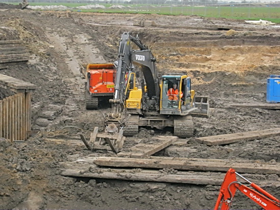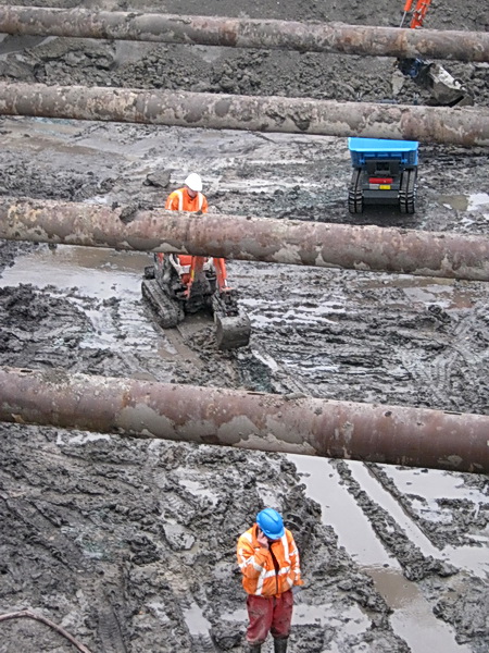 De tunnelkuip aan de oostkant, waar de (onder)grondwerkers rechtop onder de buizen kunnen staan, al lijkt het anders op de foto…. Vooraan rechts de oranje spiraalbuis van de waterafvoer. Zo eentje zit er ook aan de noordwestkant… Het water wordt dan naar een tijdelijk reservoir geleid dat achteraan wordt gegraven. (De Volvo-specialist was er vandaag druk mee!)