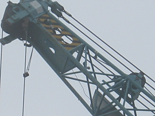 Bovenin de giek van de hijskraan zit een windmeter, in het midden van het beeld nog net te zien (voor de kenners…) Als die windmeter al te razend ronddraait, kun je het gebruik van de kraan wel vergeten… (Bij deze storm hoeft de windmeter ons verder niks meer te vertellen…)
