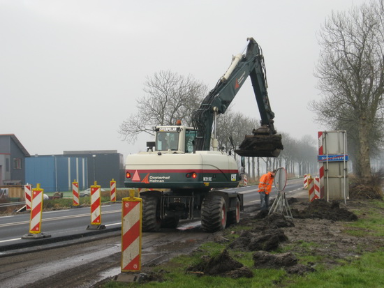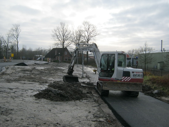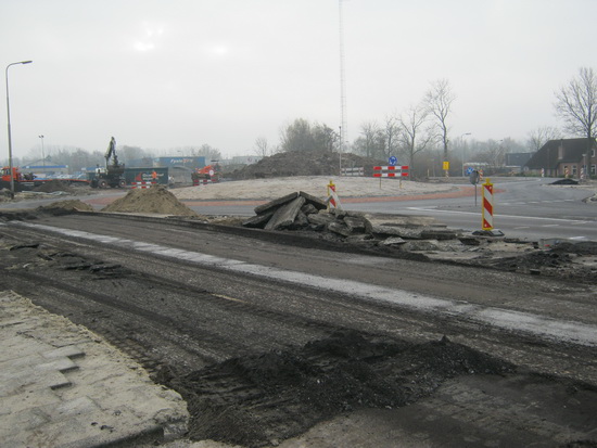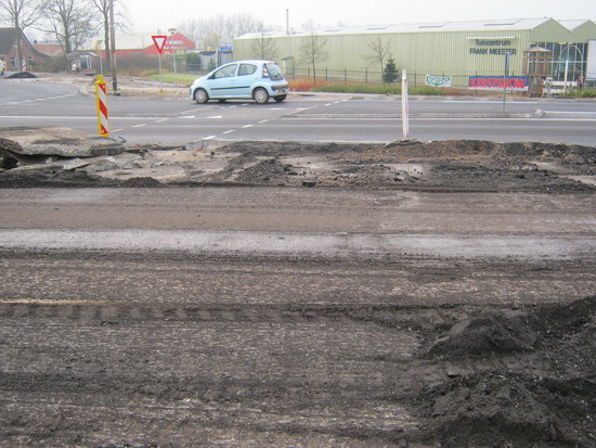 Even kijken aan het eind van de Schippersstraat, waar de doorgang over de N355 naar de Mokkenburgweg en het fietspad (én het bedrijventerrein met o.a. Tuincentrum Frank Meester) nog even op zich laat wachten… Oud asfalt wordt afgevoerd, dan de ondergrond opnieuw bewerkt. En daarna zal er wel een nieuw plaveisel op komen… Voorlopig nog steeds een omweg maken via de Industrieweg.