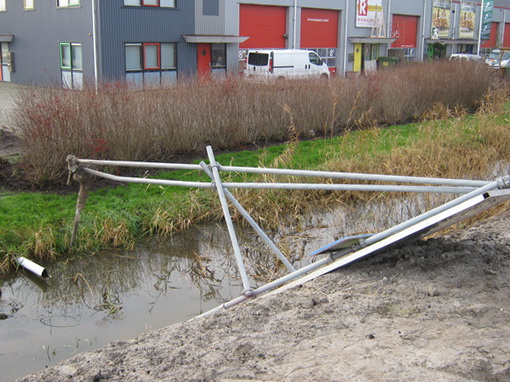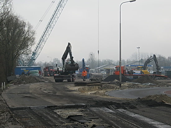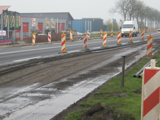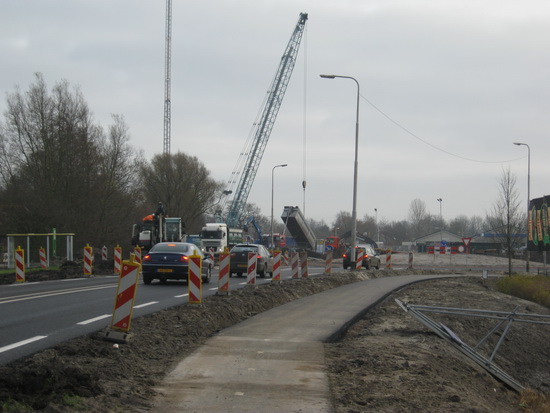 ’s Middags wil ik het eens van de westzijde bekijken, loop ik via afslag Langestraat Noord het nog steeds (voor het rijdende verkeer) gestremde fietspad op. Nadering van de nieuwe rotonde, het bord ligt al (stormbestendig??) in de slootwal…
