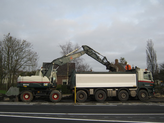 Zo gaat dat… De kraanmachinist verdeelt de brokken over de beschikbare ruimte. De chauffeur houdt het in de gaten, stuurt eventueel wat bij. Eendrachtige samenwerking!