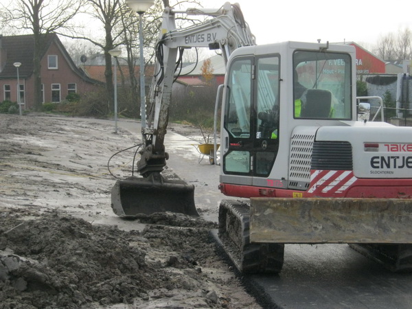 De OH-grijper en de oranje klusaanwijzer zijn ter plekke. Grond weg? Oud asfalt weg?