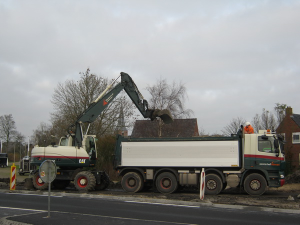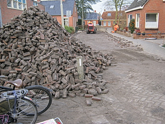 Nee, dit is geen prijsvraag: “Raad hoeveel straatstenen hier op een hoop liggen…” Het laatste stukje Oosterweg wordt herstraat. Een koude klus, maar dinsdagmiddag was het gelukkig nog tamelijk goed weer. En vonden de stratenmakers, terecht, even tijd voor een korte pauze.