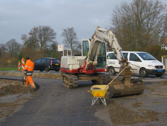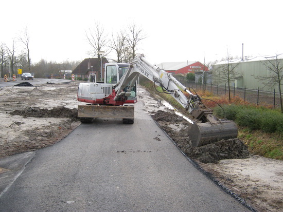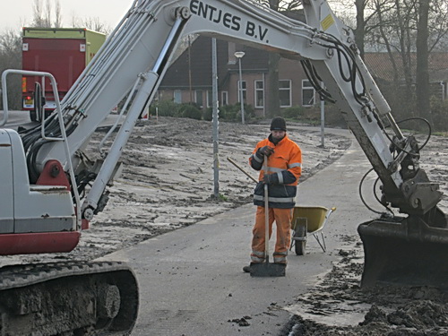 De handwerker met de brede schep, goed ingepakt, kijkt waar assistentie nodig is… Beetje bijwerken. Kan het pad open, ook voor fietsers…