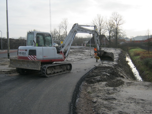 Wat me steeds weer opvalt, is de lage positie van het fietspad/Mokkenburgweg ten opzichte van de nieuwe rotonde en verbindingsweg. Hoe zal dat gaan bij hevige regenval?