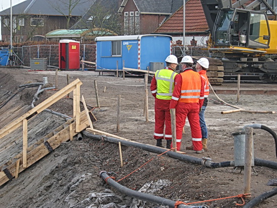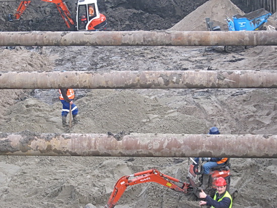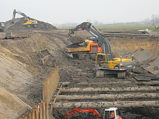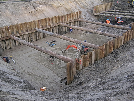 De situatie in de tunnelkuip oost. Geleidelijk aan is het voorste gedeelte voorzien van een zandlaag (waar dan later eerst vloeibaar beton op wordt gespoten). Glad strijken, meten, aanstampen, trillen…