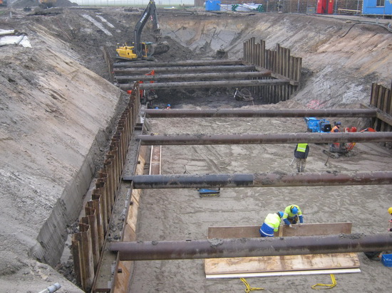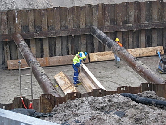 Bedrijvigheid alom in de tunnelkuip aan de oostkant. Het statief met de meter op de voorgrond, twee timmerlui, een graver, een vervoerder, de oranjejackdragers (de meters?)….Het houtwerk voor de bekisting?